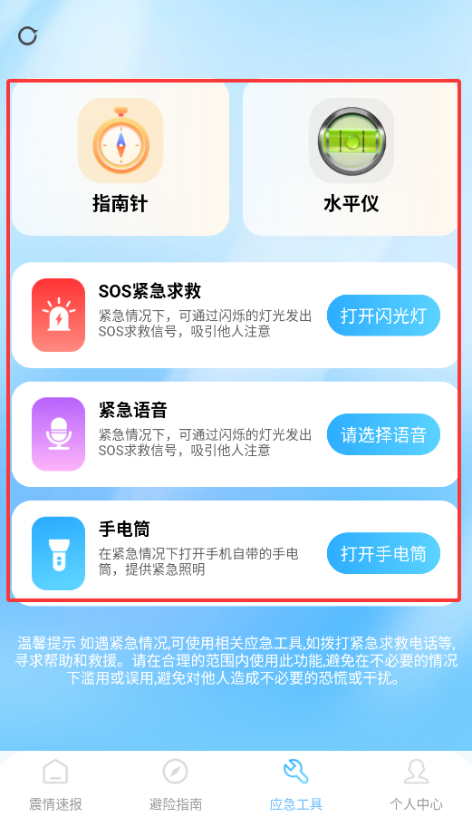 3、"应急工具箱"集成指南针、求救信号、照明等实用功能,满足紧急情况下的多种需求。