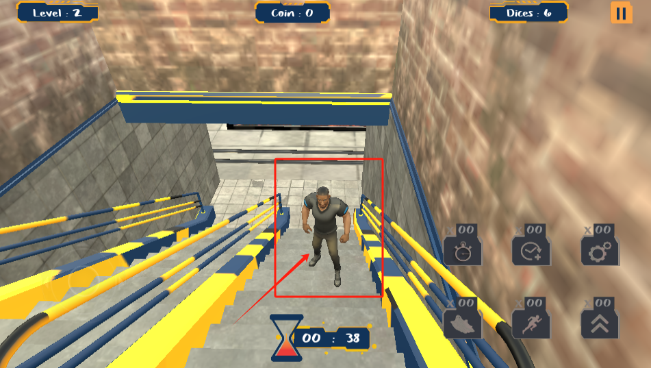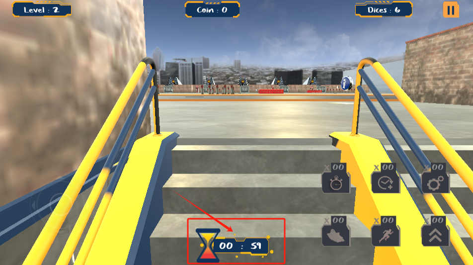 2、控制角色在51秒内爬上楼梯,注意看上方金币和骰子数量。