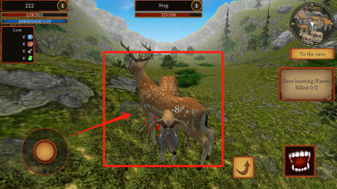3、继续追踪红框里的鹿,完成狩猎任务,看右上角任务进度0/2。