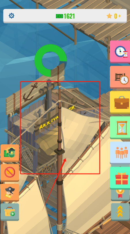 1、点红框里的按钮接海盗上船,看右上角金币有1621,星星是0。