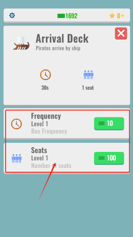 2、在Arrival Deck界面,点红箭头指的Seats升到100,船30秒来一班,能坐1人。