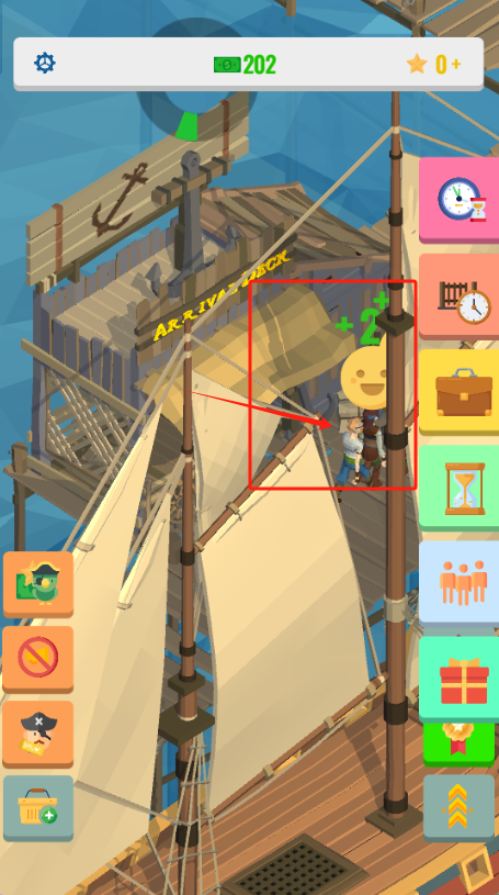 3、点红框标注的地方接+2海盗,右上角有202金币。