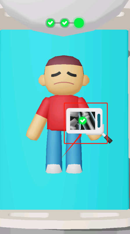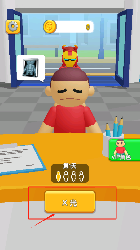 1、X光检查界面,点击X光按钮给红衣小孩做检查,完成后获得金币奖励。
