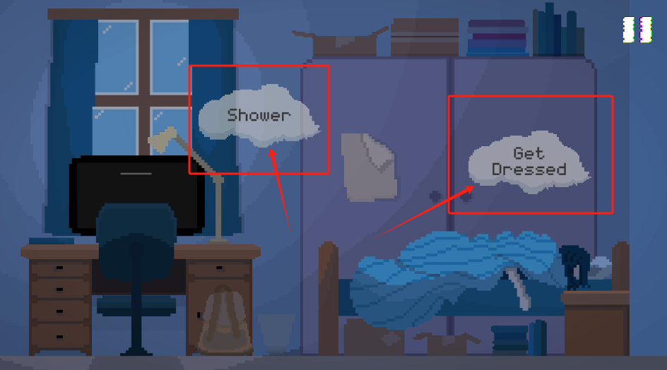 2、卧室场景,点击左边Shower去洗澡或右边Get Dressed换衣服。