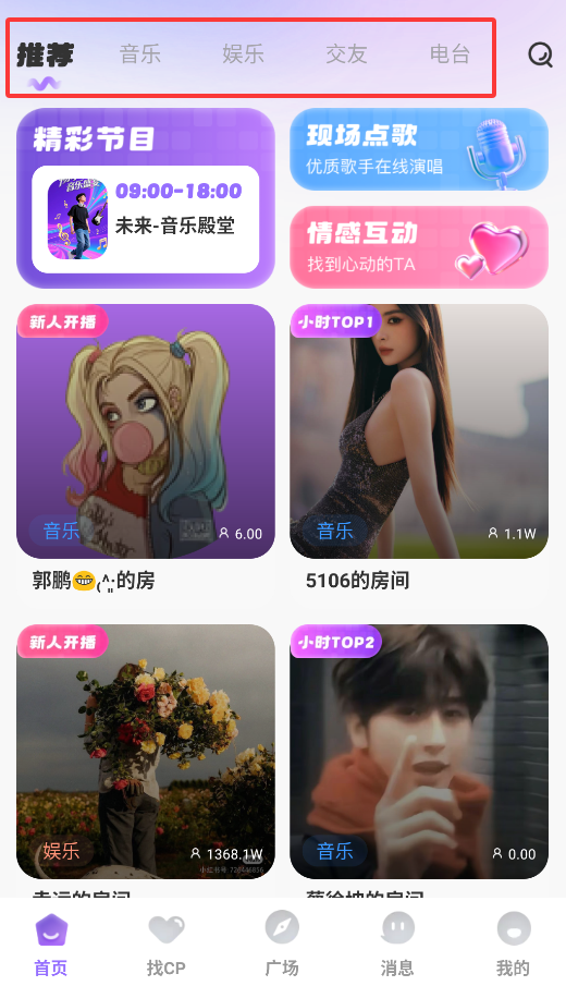 2、语音互动广场。开设音乐、游戏等主题语音房间,支持观众连麦互动,营造沉浸式社交氛围。