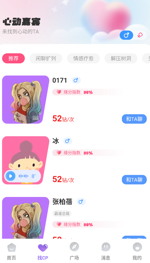 2、通过“CP匹配”功能设置偏好条件(如声音类型、兴趣标签),系统每日推荐高契合度用户。