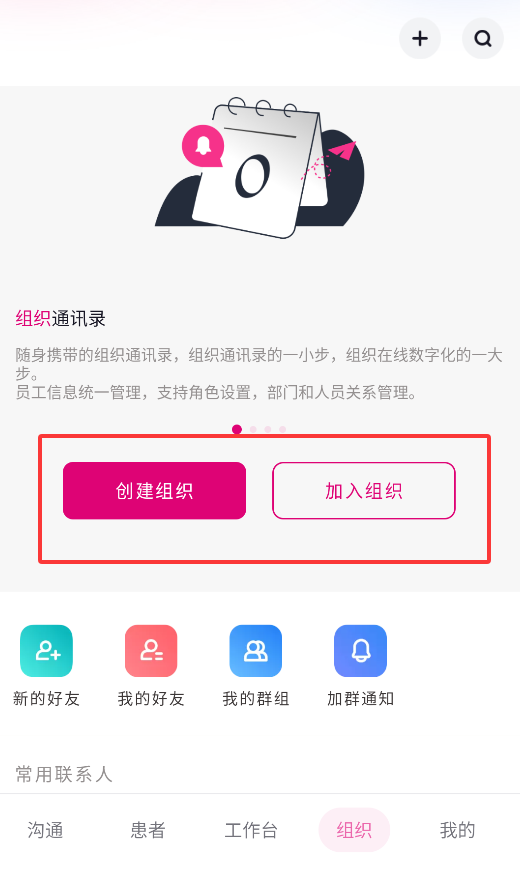 3、在“医疗组织”板块可创建科室协作群,或加入院际联合诊疗组,权限分级管理。
