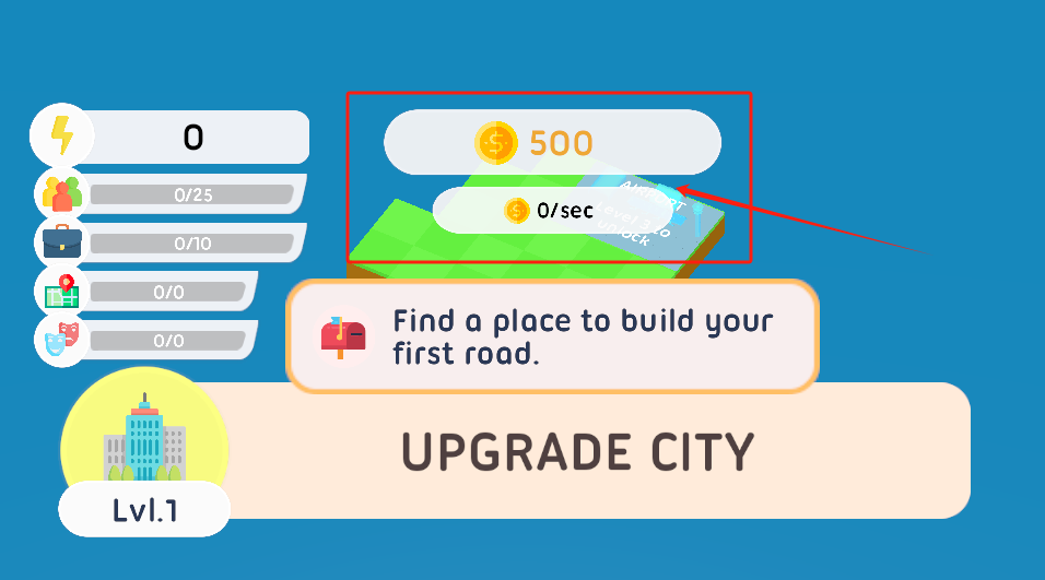 1、点空地建第一条路,注意看左上角资源都是零,右下角可以升级城市。
