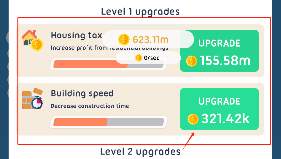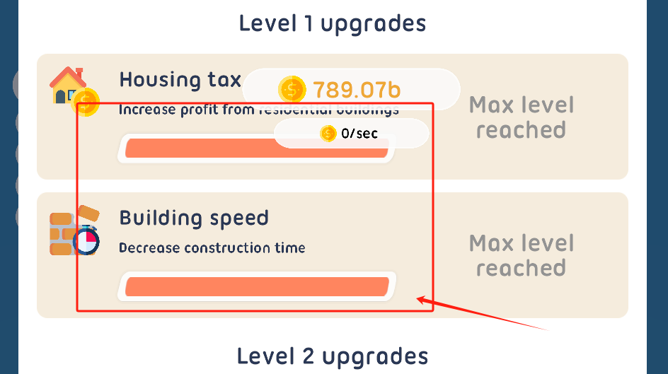 3、两个一级升级都满级了,现在等攒够钱解锁二级升级,看下面提示。