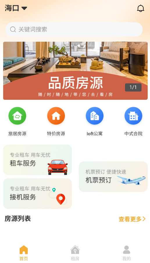 1、打开应用后,在首页的搜索栏可直接输入关键词查找房源,系统还提供旅居、特价、LOFT公寓、中式合院等特色分类快捷入口。