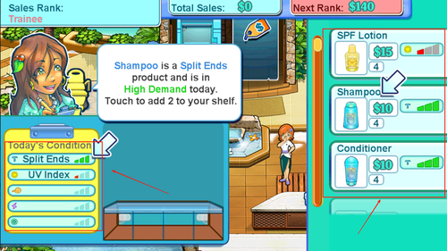 2、屏幕左侧是客户要求,右侧为各种商品,上方显示当前资金状况与客流量,方便玩家实时掌握经营状态进行调整。