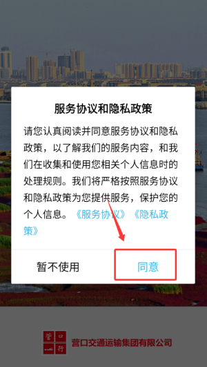 1、阅读并确认用户协议后进入系统主界面,自动定位当前位置并加载周边交通站点信息。