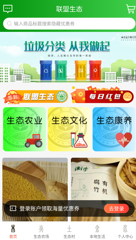 1、打开应用后,首页提供智能搜索功能,可快速查找生态农产品,同时展示"绿色农业"、"自然疗愈"、"传统文化"三大特色板块内容。