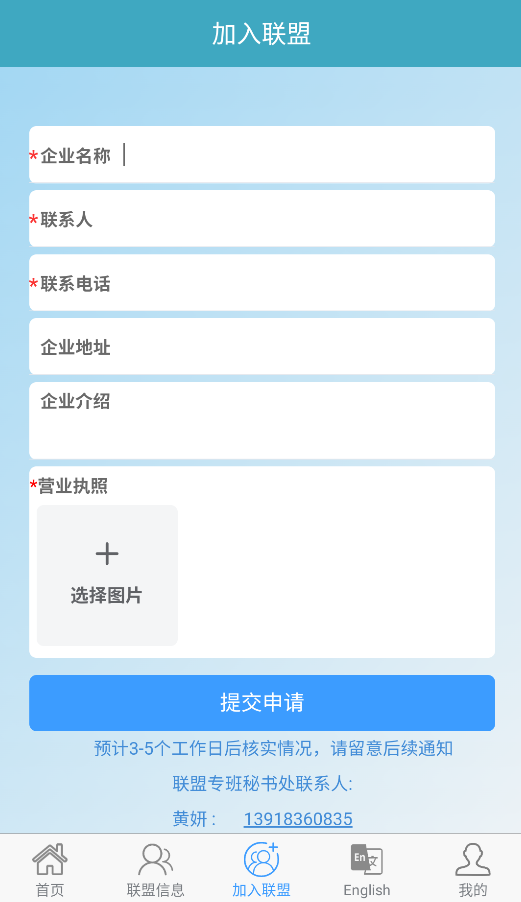 2、联盟申请需填写企业营业执照信息、联系人及主营业务,上传资质文件后进入人工审核(3个工作日内反馈结果)。