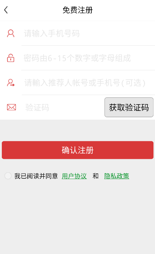 2、填写有效的手机号码,获取并输入6位数短信验证码,设置8-16位包含字母和数字的密码后完成注册。