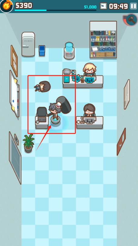 3、红框标出的人物可以操作,钱变成390块了,时间显示9点49分。