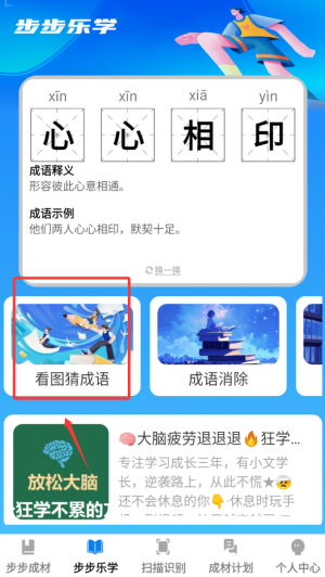 步步成材融合趣味互动与实用工具,通过看图猜谜等游戏化方式激发成语学习兴趣,内置智能学习计划系统帮助用户系统掌握成语知识。软件配备精准扫描识别功能,可快速获取各类文本信息。