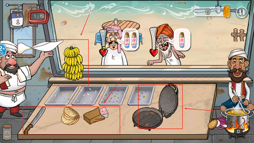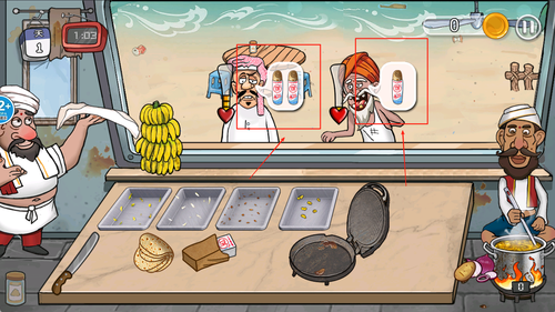 2、左侧是菜单与食材选择界面,右侧则是烹饪与出餐区域,界面清晰便于快速完成点单与制作流程提高效率。
