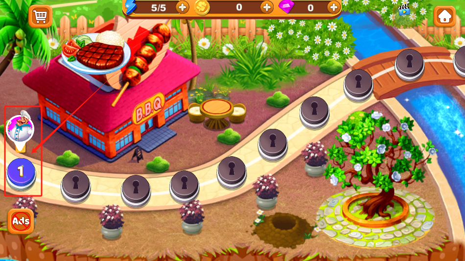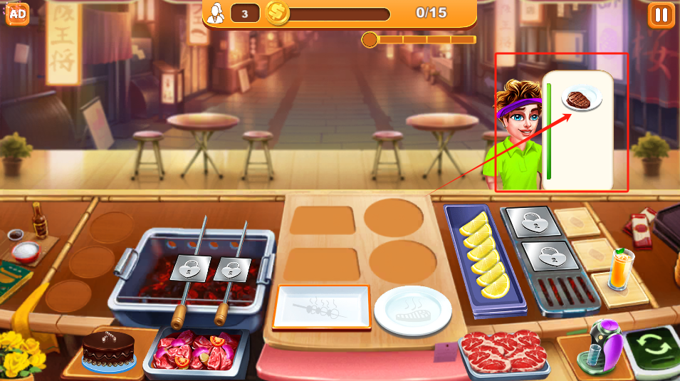 2、选BBQ烧烤店开始玩,数字1表示这是第一关。