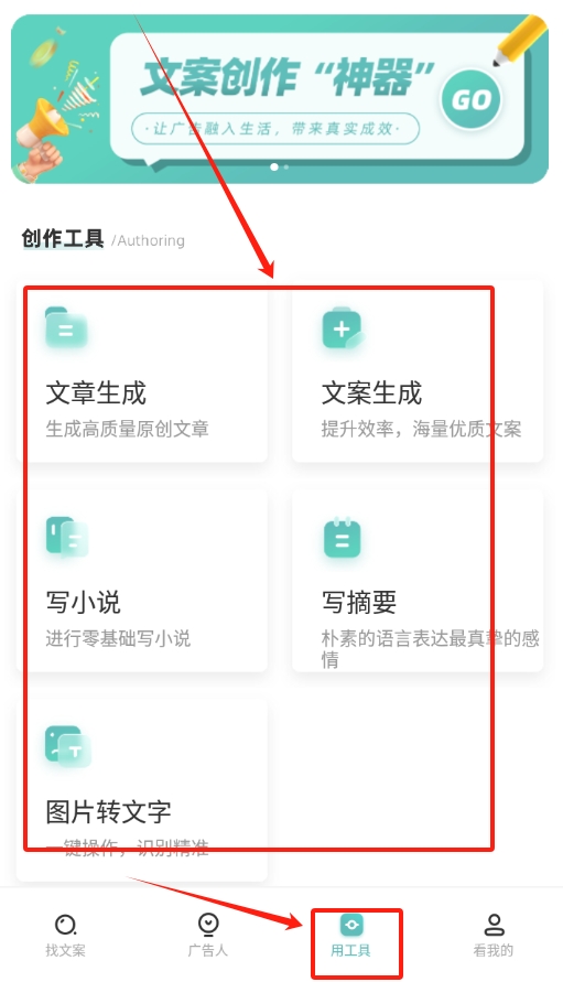 3、工具页面更实用,文章生成、写小说这些功能都有,还有图片转文字超方便。