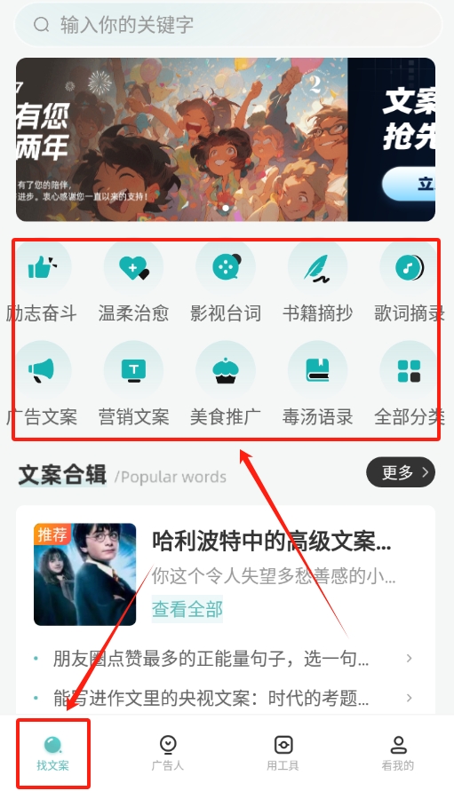 2、精准筛选内容分类:根据使用场景,在分类页面选择情感、励志、广告等不同类型文案浏览。