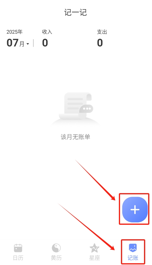 3、要记账的话,进入记账页面,点击右下角的加号,轻松记下收入和支出。