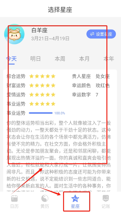 2、想知道星座运势,找到星座页面点进去,每天的事业、爱情运都能看明白。