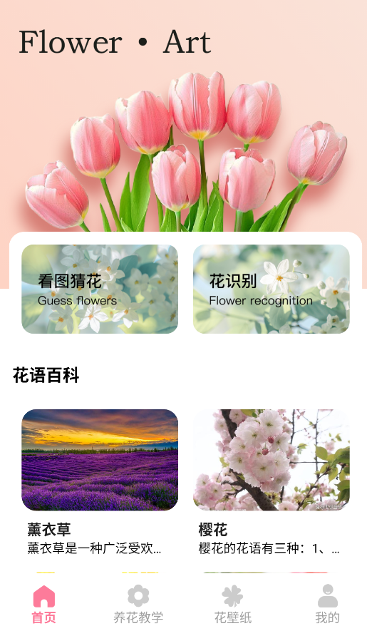 1、打开APP后,首页提供趣味"看花挑战"游戏和专业的植物识别功能,拍照即可辨别花卉种类。