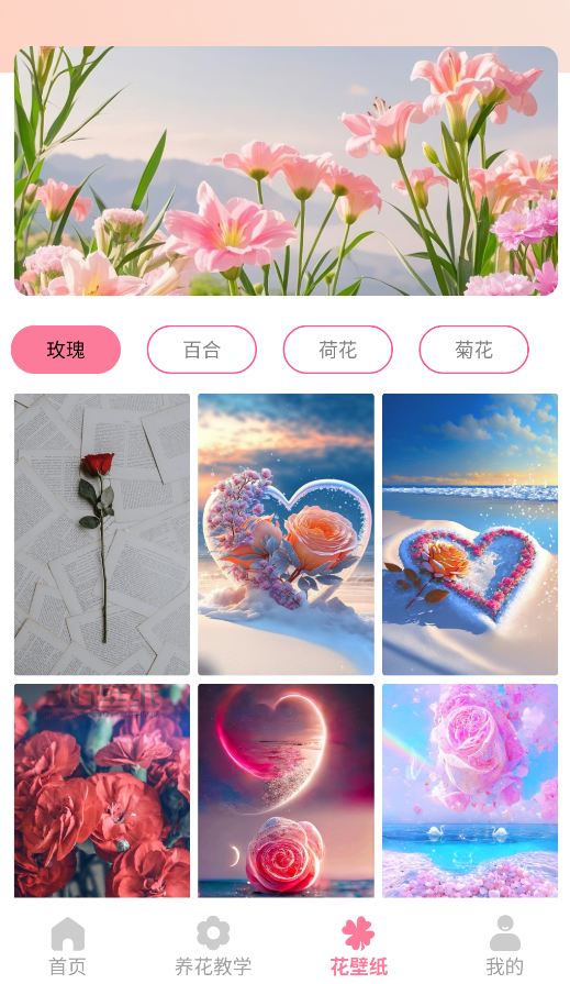 3、壁纸专区精选高清花卉摄影作品,支持一键设置为手机壁纸,随时欣赏鲜花美景。