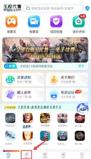 1、进入王权代售APP后,在首页导航栏点击"我要买"选项,进入账号交易页面。