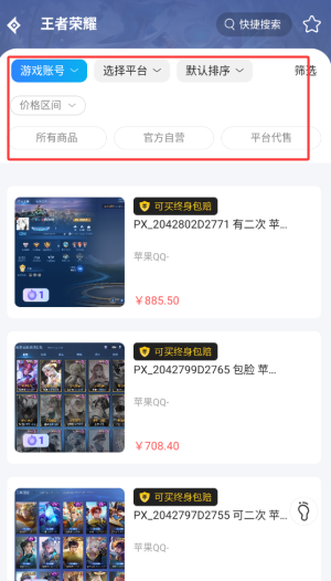 2、浏览可购买的游戏账号列表,根据等级、装备等条件筛选心仪账号。