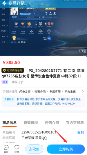 3、查看账号详细信息后,点击"立即购买"按钮完成支付即可获得账号。