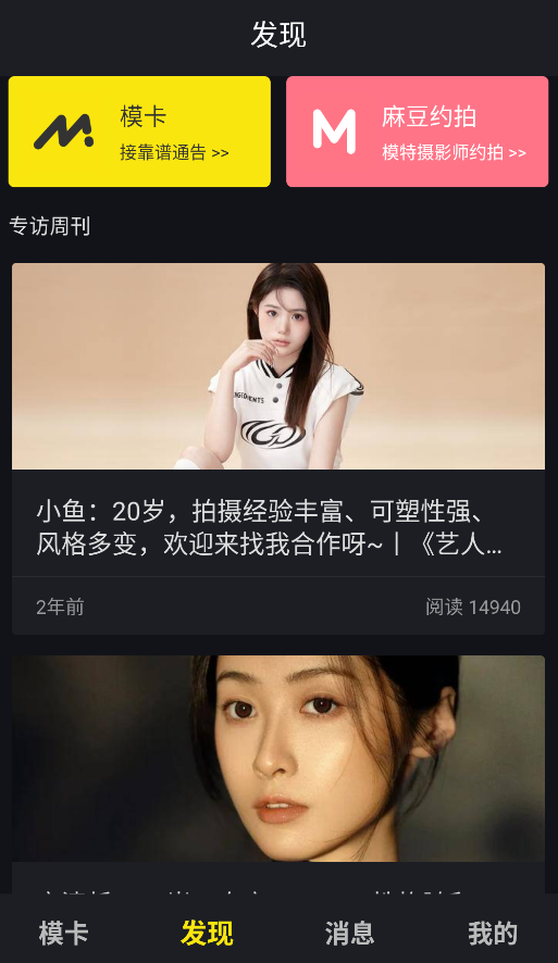 2、发现页汇聚行业通告信息,可查看最新拍摄邀约,还能阅读模特专访等专业内容。