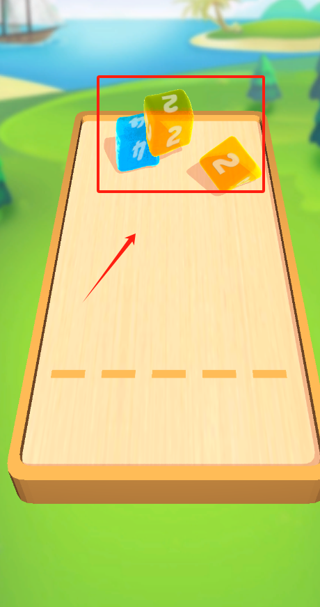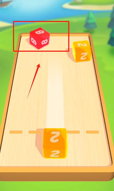 3、看到斜坡轨道上的红色8和黄色2骰子,点红框里的红色8骰子,就能让骰子开始滚动啦。