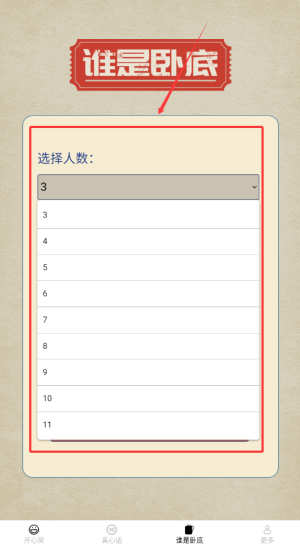 3、真心话题库丰富,帮你更了解自己,也适合朋友间破冰;卧底游戏支持自定义人数和词库,聚会时一键开局,让气氛瞬间热闹起来。