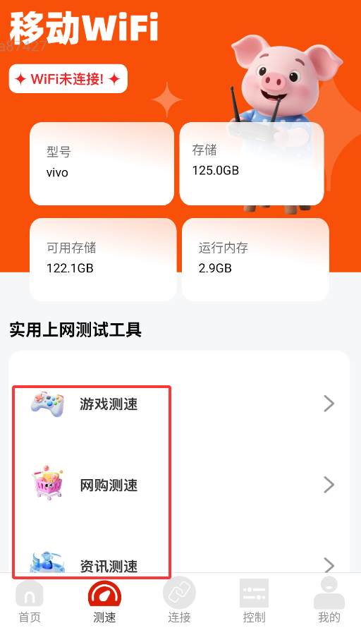 2、进入网络测速模块,支持分场景测试游戏延迟、购物加载速度等专项网络性能。