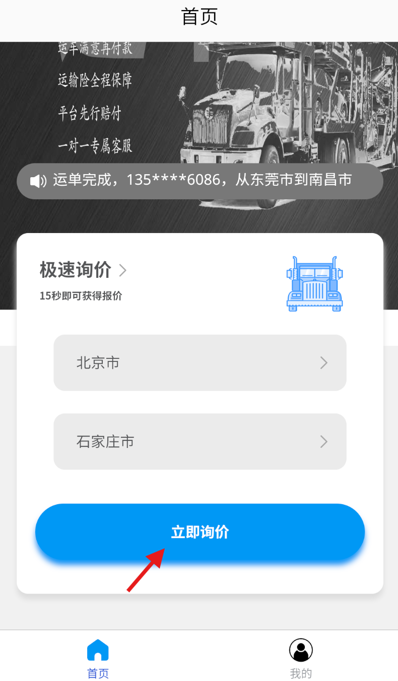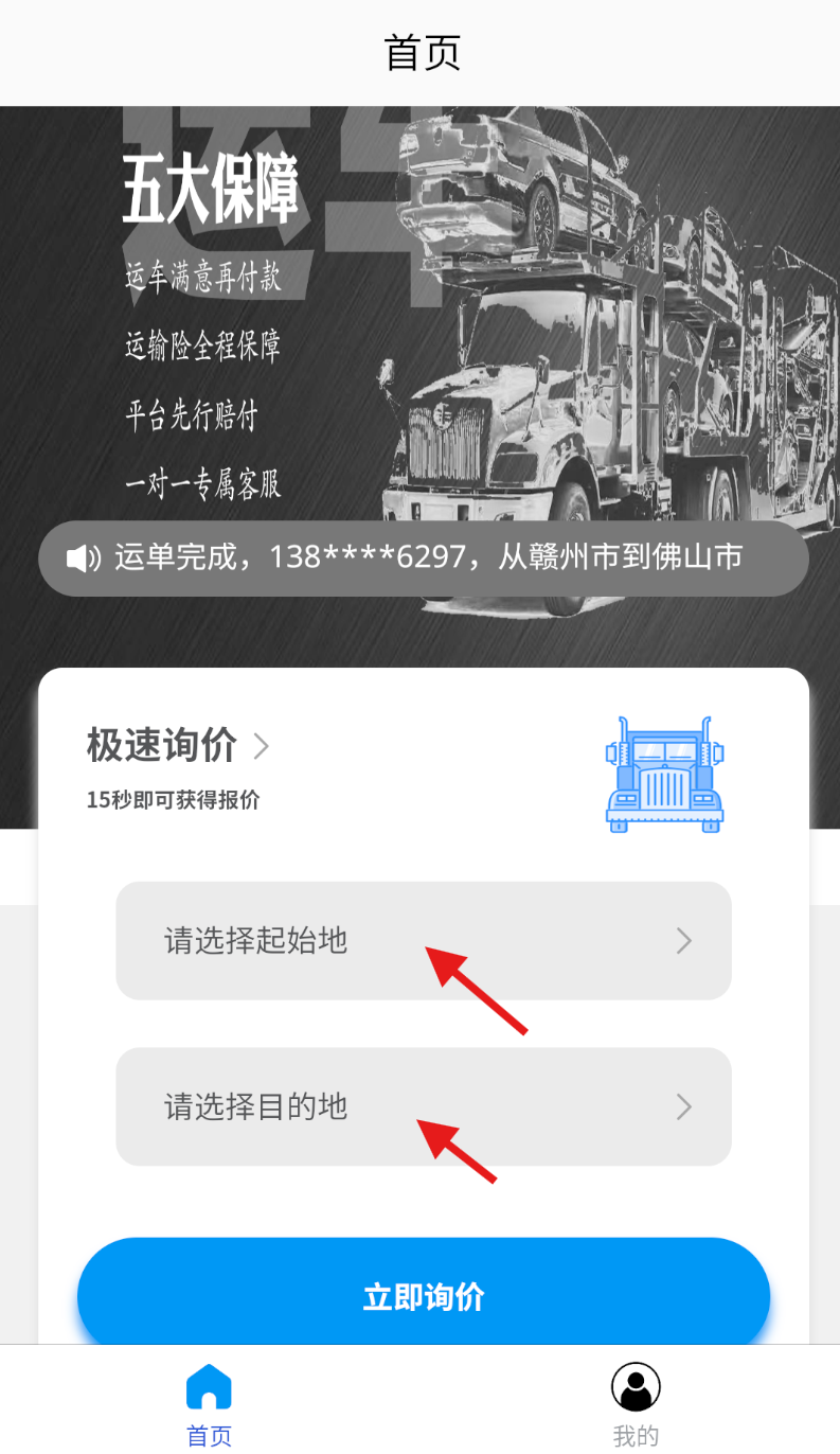 1、打开易轿运车软件,在首页找到选择起始地和目的地的选项并点击,准备设置运输的出发和到达地点。