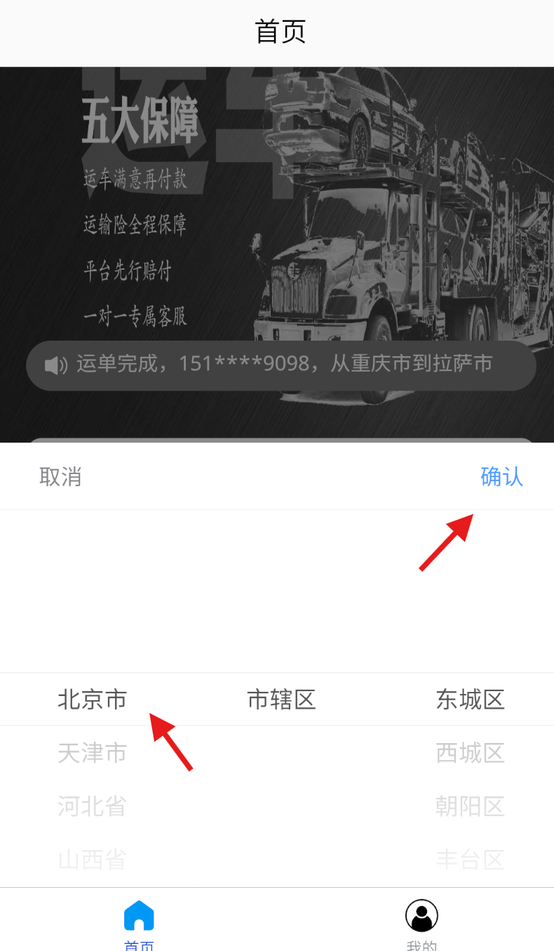 2、在地址选择界面,滑动选择起始地为北京、目的地为河北,确认地址信息无误后点击确认按钮。