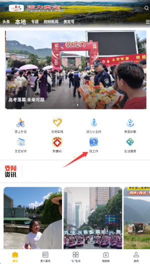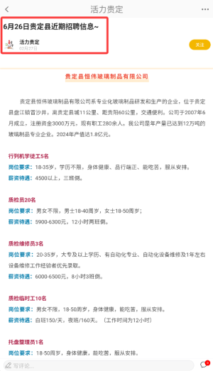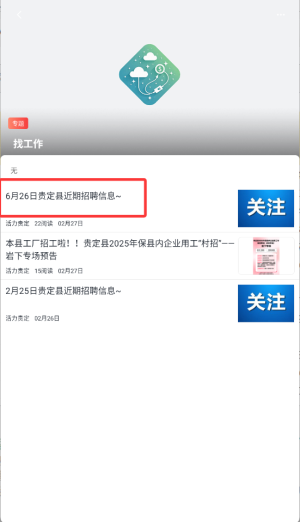 1、进入活力贵定APP后,在首页导航栏点击"找工作"选项,进入招聘信息页面。