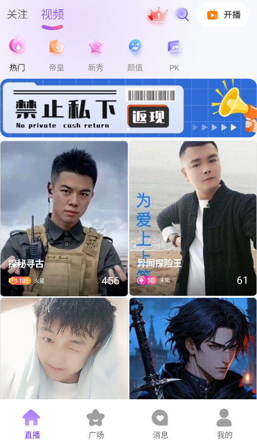 1、打开应用后,在直播专区可浏览热门分类内容,包括才艺表演、新人主播及实时互动PK等特色频道。