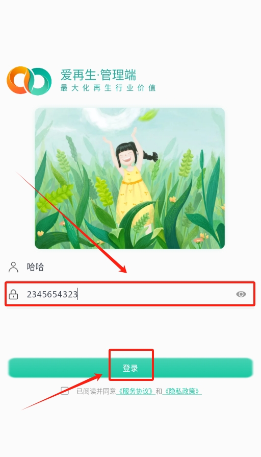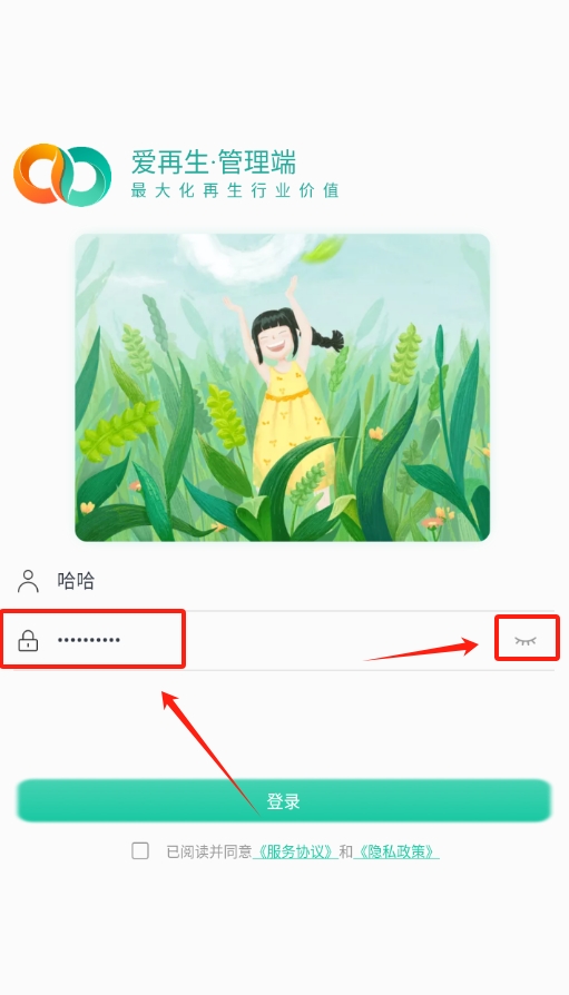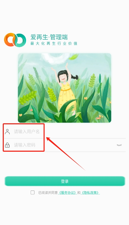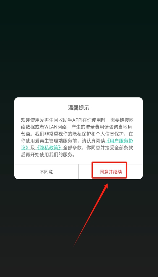 1、打开爱再生回收助手后,会出现软件协议,仔细看看内容没什么问题,点击同意,就能继续下一步操作进入登录页面了。