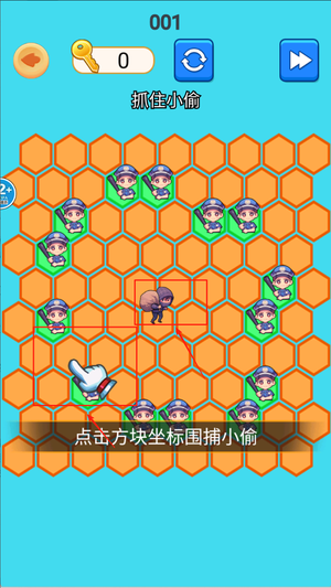 抓住小偷是轻松有趣的休闲闯关游戏,玩家需要在每一关中合理布置警察位置,围堵小偷完成抓捕任务。游戏中设置了丰富的关卡和不同难度的挑战,每关都有步数限制,考验你的策略与规划能力。可以通过使用道具、钥匙提示等功能辅助通关,还能解锁各种角色提升抓捕效率。