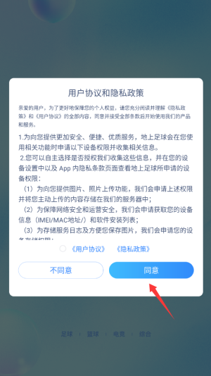 1、启动地上足球APP后,首次使用需阅读并同意用户协议和隐私政策,点击确认进入主界面。