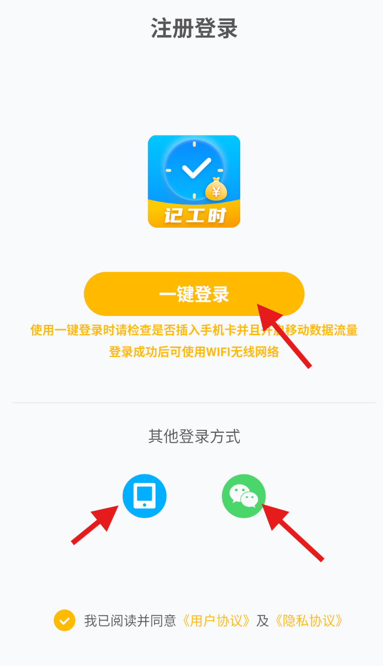 1、打开小时工记账 Time 计时器,可选择一键登录、微信登录或手机号注册登录账号,完成后进入软件。