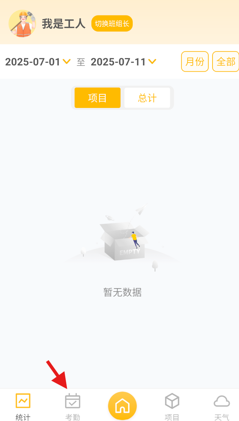 2、进入软件统计页面,在页面导航栏中找到 “考勤” 选项并点击,切换至考勤相关操作页面。