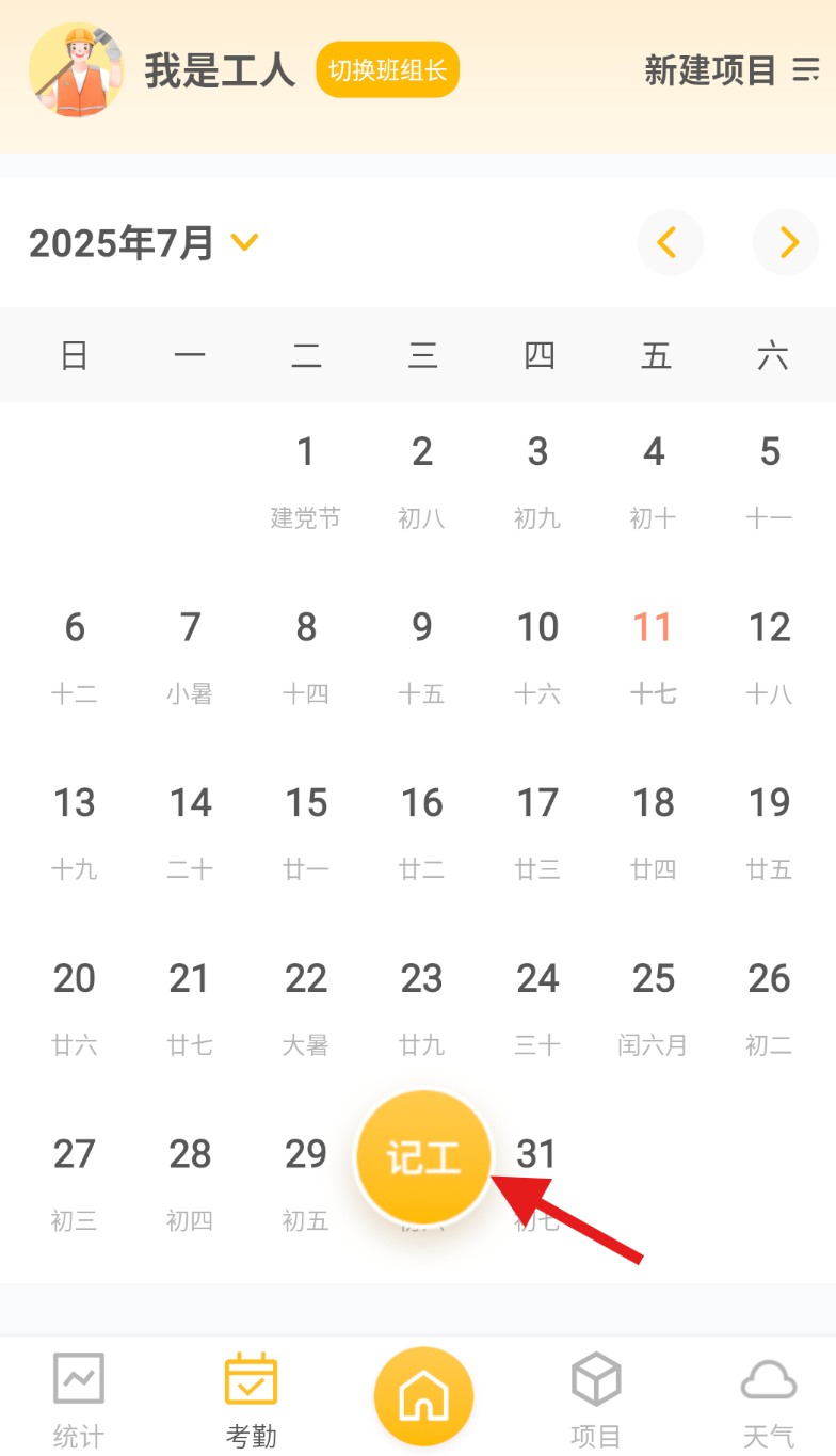 3、在考勤页面中,找到下方的 “记工” 选项并点击,进入需要填写记工信息的具体页面。
