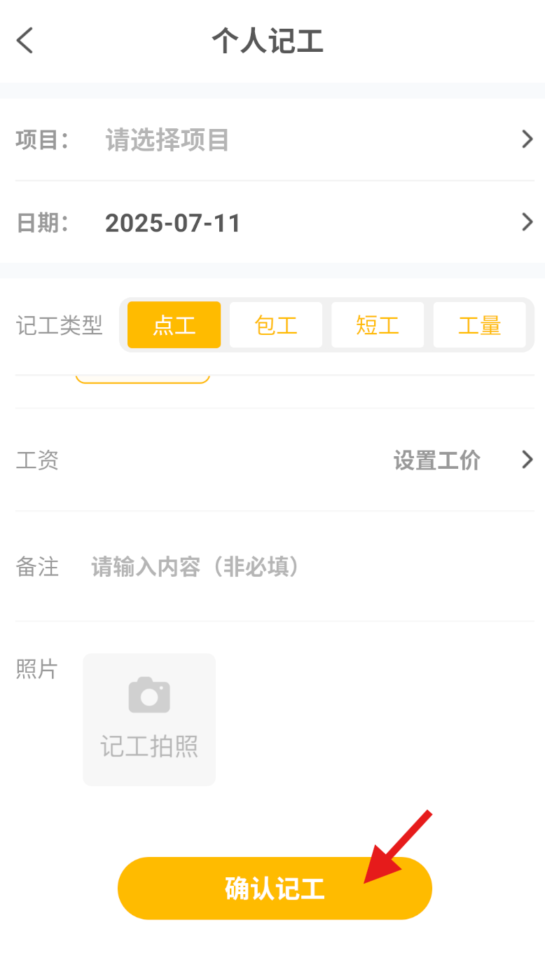 4、在记工页面中,按要求填写相关的工作信息,确认信息无误后,点击 “确认记工” 即可完成操作。