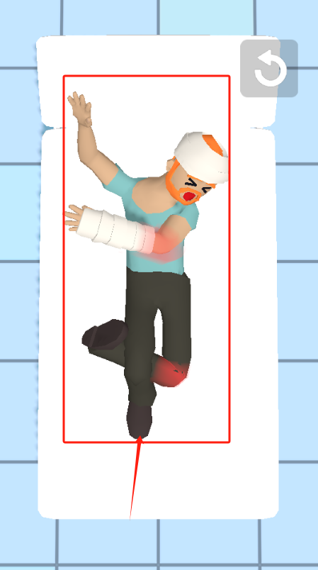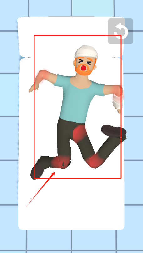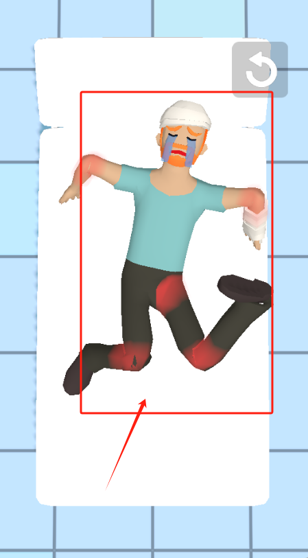 2、拖动红色箭头检查男主动作,观察全身伤势,特别是右臂和左膝的红色伤处。