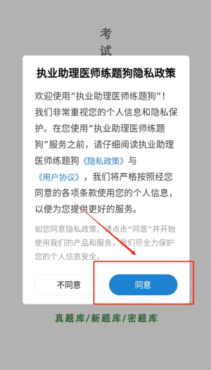 1、首次启动需仔细阅读并确认用户协议内容,点击同意按钮后即可进入应用主界面开启备考学习。
