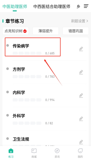 2、在章节练习模块中按临床医学、预防医学等科目分类选择,系统提供各章节重点知识点及配套试题。